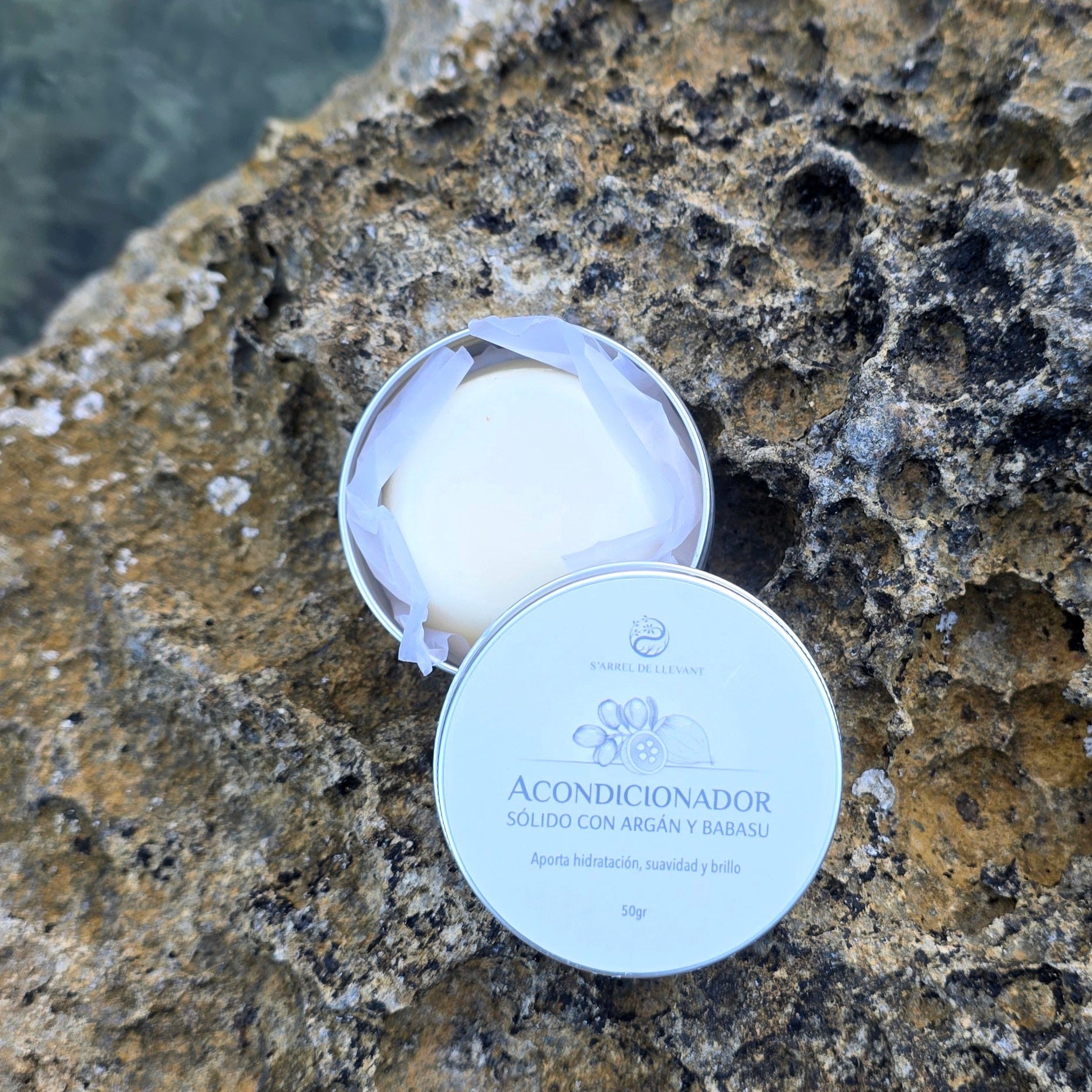 El Acondicionador Sólido Hidratante de S'Arrel de Llevant es una pastilla artesanal 100 % natural, formulada para todo tipo de cabello. Su combinación de manteca de cacao, aceite de argán, aceite de ricino y aceite de babasú ofrece una hidratación profunda, control del frizz y una suavidad duradera. Su textura cremosa y su delicado aroma a lavanda convierten cada lavado en un momento de cuidado y placer.