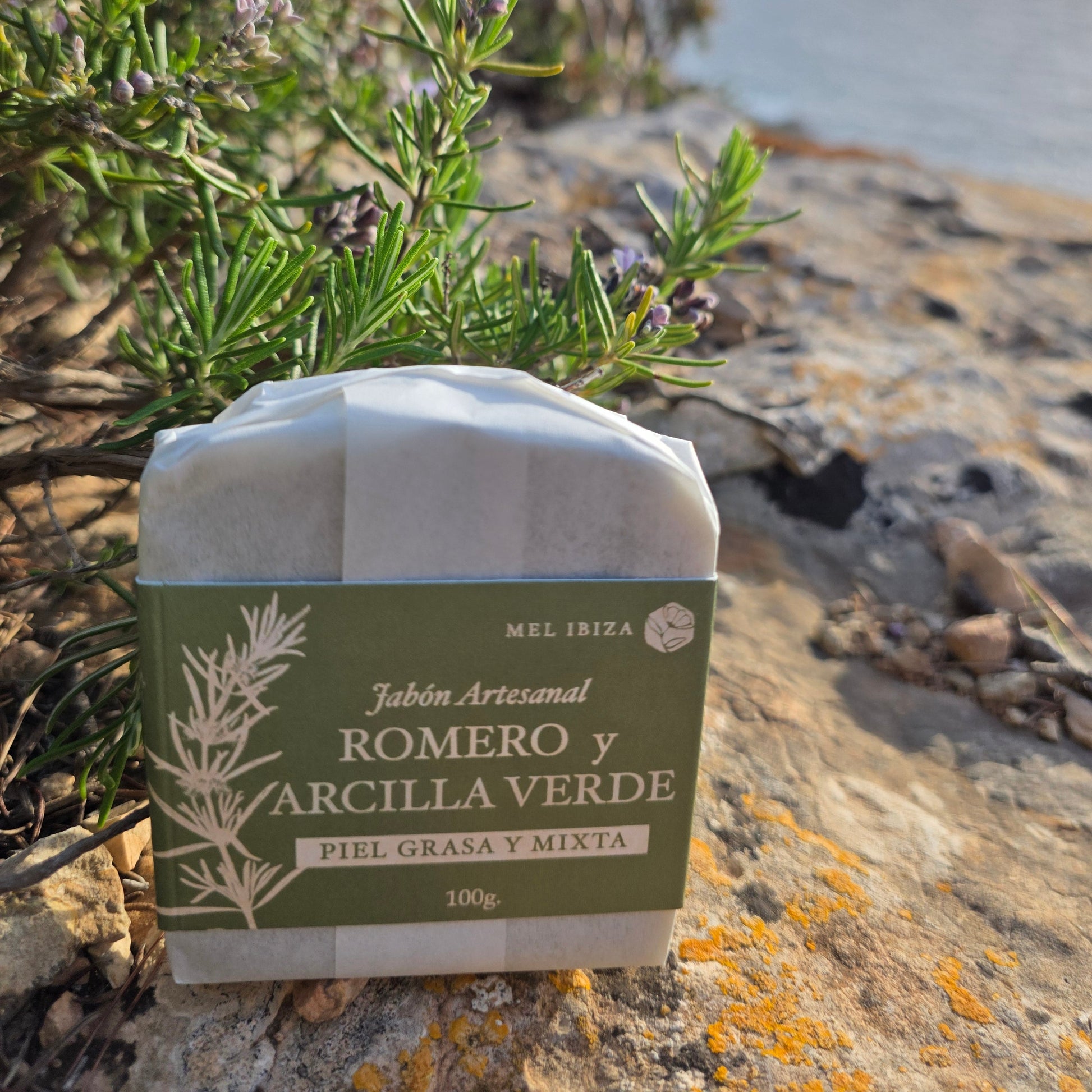 El Jabón de Romero y Arcilla Verde de Mel Ibiza es un jabón artesanal 100 % natural, formulado para pieles grasas, mixtas o con tendencia acneica. Gracias a su base de aceite de oliva virgen y aceites esenciales de romero y limón, regula el exceso de grasa, limpia en profundidad y aporta una sensación de frescor y limpieza duradera. La arcilla verde y la espirulina ofrecen propiedades desinfectantes que ayudan a curar y eliminar heridas y cicatrices causadas por el acné. Ideal para rostro y cuerpo, apto también para pieles sensibles.