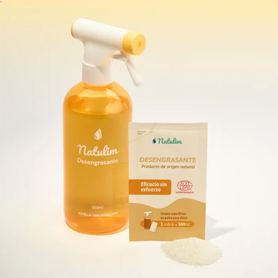 El Pack Desengrasante de Natulim es un sistema reutilizable pensado para eliminar la grasa incrustada en cocinas y superficies de forma ecológica. Incluye una botella reutilizable y sobres en polvo que se disuelven en agua para formar un potente limpiador multiusos. Su fórmula certificada EcoCert combina eficacia con respeto al medio ambiente, sin fragancias sintéticas ni químicos agresivos.