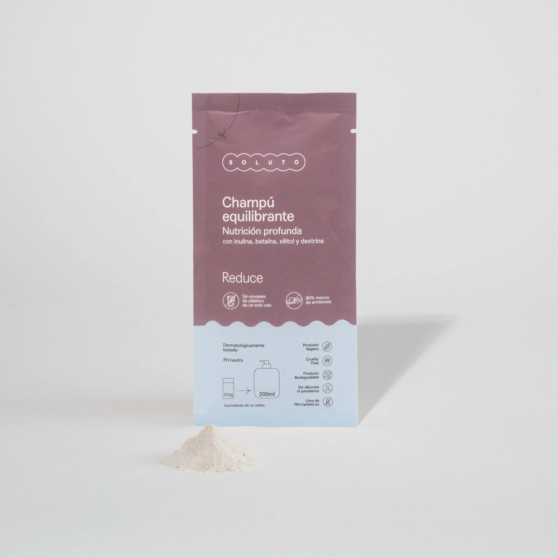 El Champú Equilibrante de Soluto es una recarga en polvo que, al mezclarla con agua, genera 200 ml de champú líquido diseñado para equilibrar la producción de grasa del cuero cabelludo, sin descuidar la hidratación que necesita tu cabello.